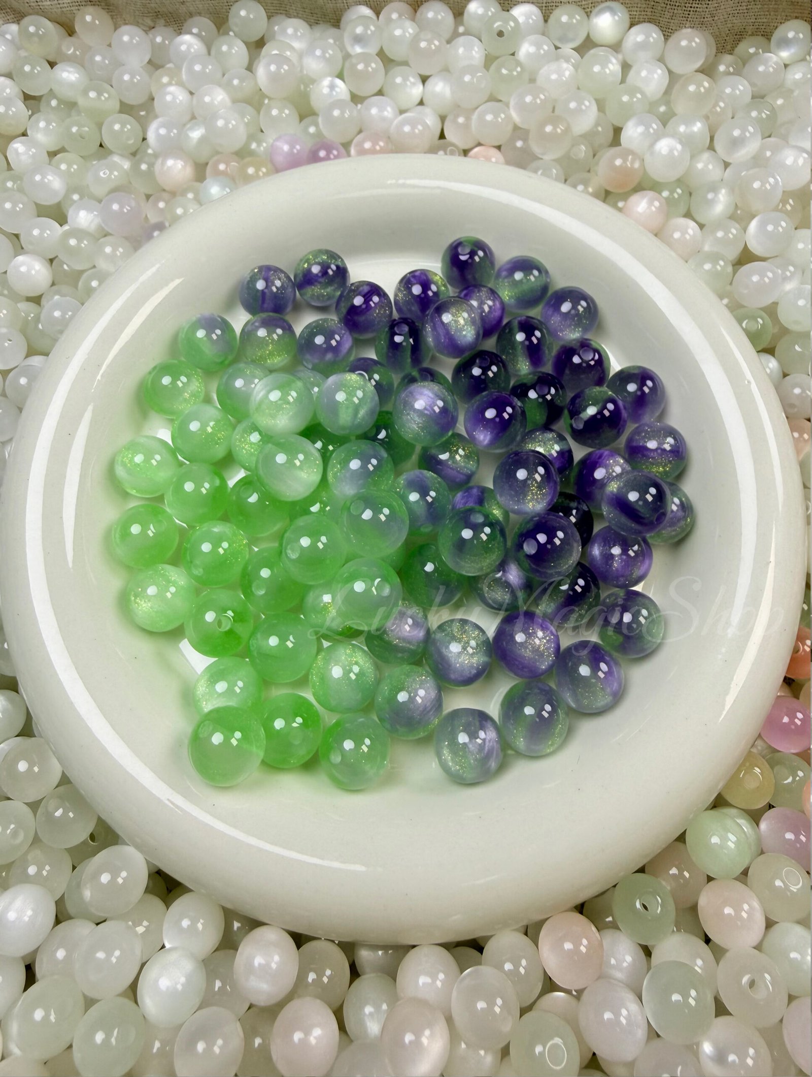 Energy Stone Beads are made of resin, creating cat eye beads with a highly polished, smooth, round and shiny surface.